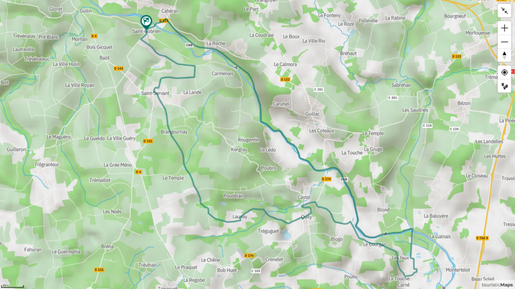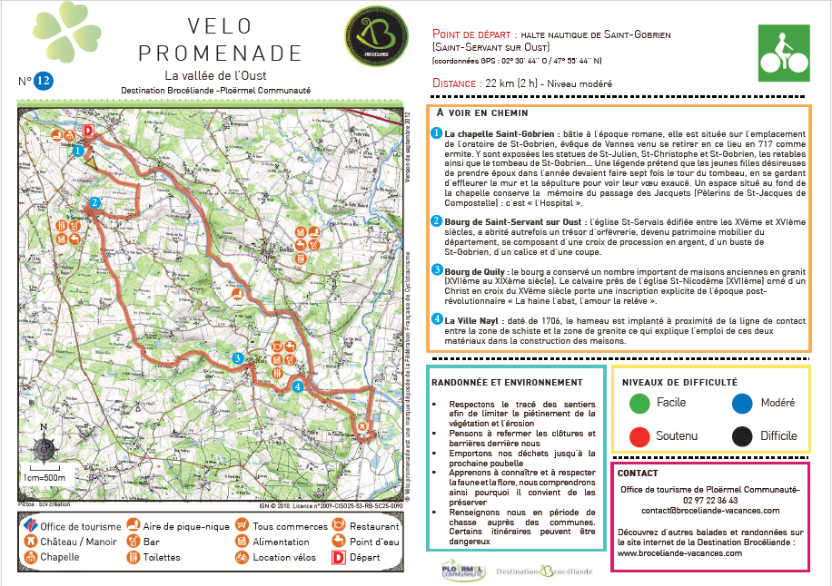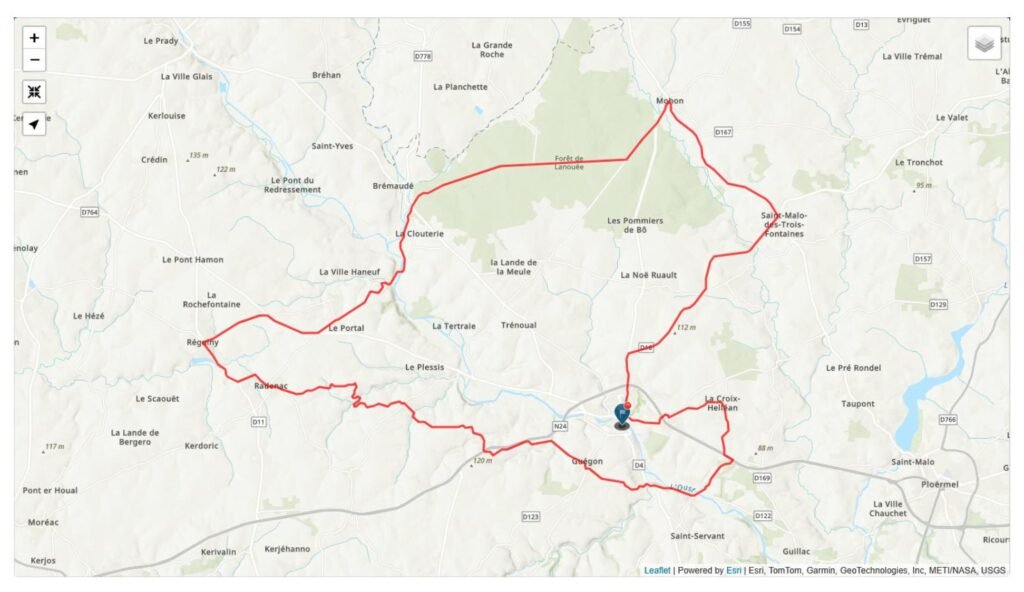 Ce circuit commence à Josselin, petite cité de caractère, étape capitale sur la route des Ducs de Bretagne. Située dans un cadre exceptionnel, au bord de l’Oust, Josselin dispose d’un patrimoine riche et ancien fortement lié à l’histoire de la région, notamment l’imposant château des Rohan accroché à flanc de colline, la basilique Notre-Dame-du-Roncier, les nombreuses maisons à colombages et à pans de bois dont la plus ancienne date de 1538. Vous quitterez Josselin en direction de la Croix-Helléan, dont l’église recèle une superbe piéta en bois polychrome du XVIe siècle et le tombeau des Seigneurs du Broutay. Poursuivez votre route et arrêtez-vous pour admirer la chapelle Saint-Gobrien, XIVe et XVIe siècle. Entouré d’une clôture en bois, le tombeau du Saint dans le choeur de la chapelle date du XIVe siècle. En suivant l’Oust, vous vous dirigerez vers Guégon, dont l’église paroissiale est d’origine très ancienne. Devant cet édifice, vous verrez une lanterne des morts « rare » sculptée dans le granit, autrefois allumée du jour du décès au jour de l’enterrement. Vous arriverez ensuite au village des Forges. Il s’agit des forges de Lanouée où fut construite en 1756 une fonderie de canons au service de la marine royale. Il subsiste l’ancienne maison du maître des forges. Par la D117, à travers la forêt de Lanouée, vous rencontrerez » le camp des rouets « , ancien camp romain devenu résidence des Rois Bretons. Des Douves de 10 sur 18 m demeurent toujours. Par Saint-Malo-des-Trois-Fontaines, dont l’une des Fontaines dédiée à Saint-Malo aurait selon la légende la propriété de ne pas bouillir, vous reviendrez à Josselin.